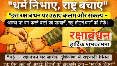 “रक्षाबंधन पर्व पर संकल्प लें – आस्था की रक्षा कर धर्म निभाएं, साजिशों से डटकर राष्ट्र बचाएं।”