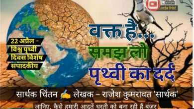 वक्त है… समझ लो पृथ्वी का दर्द22 अप्रैल – विश्व पृथ्वी दिवस विशेष संपादकीय– राजेश कुमरावत ‘सार्थक’ धरती, जिसे वेदों…