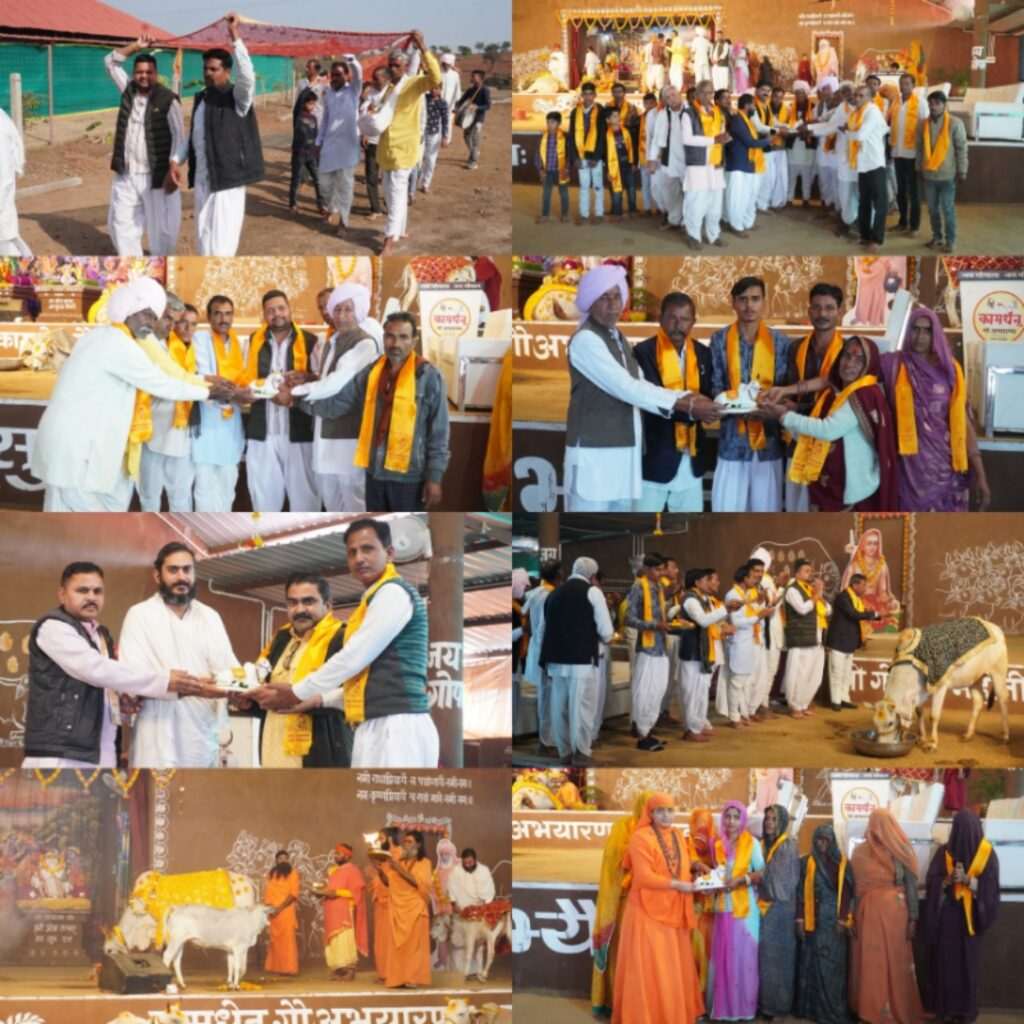 ⏩ 286 वे दिवस पर चुनरी यात्रा मध्यप्रदेश से :: एक वर्षीय गोकृपा कथा के 286 वें दिवस पर चुनरी यात्रा मध्यप्रदेश के राजगढ़ जिले गागोरनी से सरपंच महेश राव,घनश्याम बैरागी, गोवर्धन मालाकार, भवानी शंकर कुंभकार सहित ग्राम के पंच पटेलो ने अपने सम्पूर्ण ग्राम की और से एवं आगर मालवा जिले की बडौद तहसील के डाबला खास से रघुनाथ सिंह,तंवर, कालू सिंह,डॉक्टर बहादुर सिंह, करण सिंह,कुंवर श्याम सिंह,नेपाल सिंह,सुरे सिंह, पंडित योगेश शर्मा,कालू सिंह,शंभु एवं चेन सिंह ने अपने ग्राम के युवा एवं मातृशक्ति के साथ सम्पूर्ण विश्व के जन कल्याण के लिए गाजे बाजे के साथ भगवती गोमाता के लिए चुनरी लेकर पधारे और कथा मंच पर विराजित भगवती गोमाता को चुनरी ओढ़ाई एवं गोमाता का पूजन कर स्वामी गोपालानंद सरस्वती महाराज से आशीर्वाद लिया और अंत में सभी ने गो पूजन करके यज्ञशाला की परिक्रमा एवं गोष्ठ में गोसेवा करके सभी ने गोव्रती महाप्रसाद ग्रहण किया।