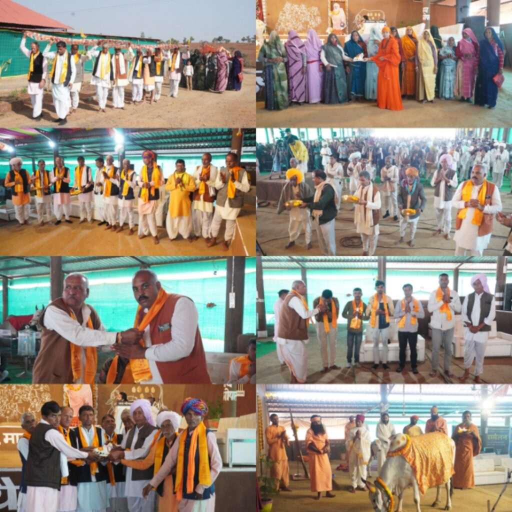 ⏩ 288 वे दिवस पर चुनरी यात्रा मध्यप्रदेश के राजगढ़ जिले से :: एक वर्षीय गोकृपा कथा के 288 वें दिवस पर चुनरी यात्रा मध्यप्रदेश के आगर जिले की सुसनेर खिलचीपुर तहसील के सालरी ग्राम सुल्तान सिंह,हीरालाल, प्रेम सिंह, करण सिंह, किशन लाल, इन्द्र सिंह, नारायण सिंह,गोली सिंह बालू सिंह एवं ग्राम की महिला मंडल ने अपने सम्पूर्ण ग्राम की और से सम्पूर्ण विश्व के जन कल्याण के लिए गाजे बाजे के साथ भगवती गोमाता के लिए चुनरी लेकर पधारे और कथा मंच पर विराजित भगवती गोमाता को चुनरी ओढ़ाई एवं गोमाता का पूजन कर स्वामी गोपालानंद सरस्वती महाराज से आशीर्वाद लिया और अंत में सभी ने गो पूजन करके यज्ञशाला की परिक्रमा एवं गोष्ठ में गोसेवा करके सभी ने गोव्रती महाप्रसाद ग्रहण किया।