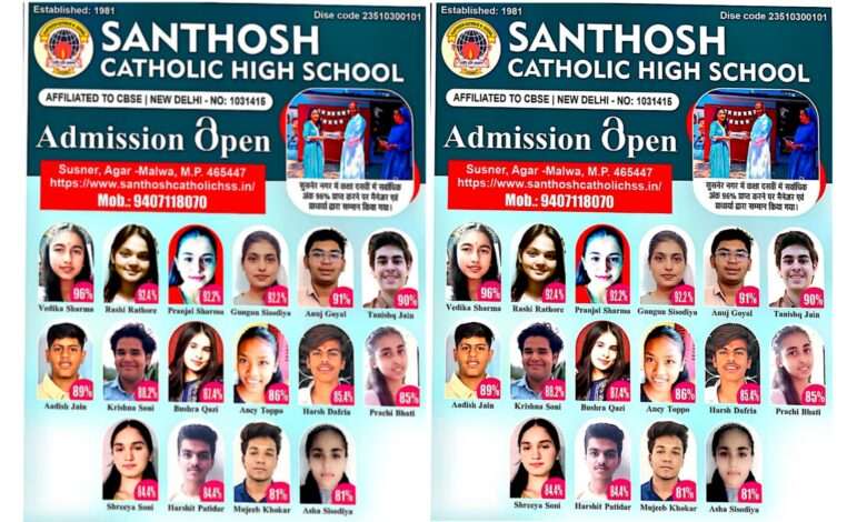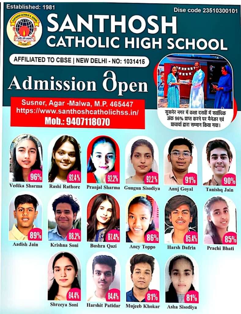 शिक्षा के क्षेत्र में चार दशकों से अधिक की उत्कृष्ट सेवा देने वाला Santhosh Catholic High School, सुसनेर ने इस वर्ष बोर्ड परीक्षाओं में एक बार फिर शानदार प्रदर्शन किया है। CBSE से मान्यता प्राप्त इस प्रतिष्ठित स्कूल के विद्यार्थियों ने 96% तक अंक हासिल कर शहर का नाम रोशन किया।