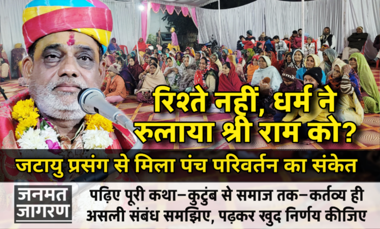 कथावाचक ने दशरथ–जटायु प्रसंग के माध्यम से यह संदेश दिया कि ईश्वर संबंधों से नहीं, कर्तव्य और करुणा से प्रसन्न होते हैं।