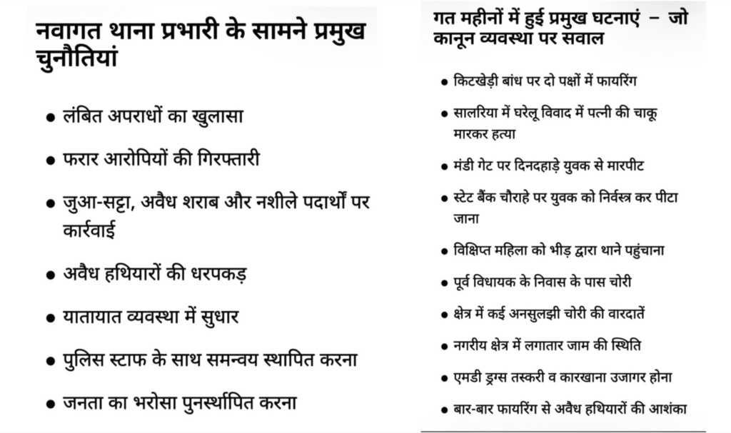 नवागत थाना प्रभारी के लिए यह पदस्थापना केवल एक प्रशासनिक दायित्व नहीं, बल्कि एक अग्निपरीक्षा है।