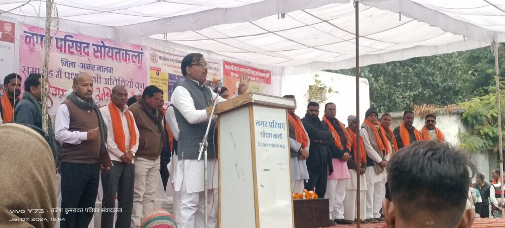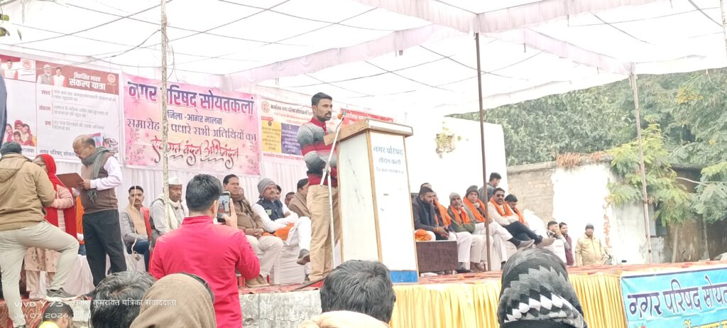 जनमत जागरण @ सोयतकलां दीपक जाटव :: विकसित भारत संकल्प यात्रा अंतर्गत रविवार को नगरीय निकाय सोयतकलां में जनकल्याणकारी शिविर आयोजित किया गया। शिविर में अतिथियों द्वारा प्रधानमंत्री उज्ज्वला योजना, प्रधानमंत्री आवास योजना, आयुष्मान भारत योजना सहित अन्य जनहितैषी योजनाओं की जानकारी देकर उपस्थित जनों से लाभ लेने का आह्वान किया तथा पात्र हितग्राही को हितलाभ का वितरण किया। शासकीय कन्या हाई स्कूल में आयोजित शिविर में जिला अध्यक्ष चिंतामण राठौर, पूर्व विधायक राणा विक्रम सिंह, न.प. अध्यक्ष प्रतिनिधि कु० पुष्कर राजसिंह जादौन, भाजपा के युवा नेता भारत सिंह चौहान, नायब तहसीलदार रामेश्वर दांगी ,मुख्य नगर पालिका अधिकारी देवेंद्र कुमार वत्स,थाना प्रभारी यशवंतराव गायकवाड, पार्षदगण अन्य जनप्रतिनिधि एवं अधिकारी उपस्थित रहे।