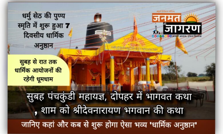 – धर्मु सेठ की पुण्य स्मृति में शुरू हुआ सात दिवसीय धार्मिक अनुष्ठान यह भव्य आयोजन :: नलखेड़ा तहसील में ग्राम पड़ाना एवं धंदेड़ा के बीच स्थित मालवा का प्राचीन मंदिर श्री देवनारायण देवझरी मंदिर में स्व. श्री धर्मेंद्र राठौर् (धर्मु सेठ) की पुण्य स्मृति में गोविंद राठौर द्वारा करवाया जा रहा है । इस सात दिवसीय धार्मिक अनुष्ठान में श्री हरि हरात्मक पंचकुंडात्मक महायज्ञ, तुलसी विवाह, श्री मद्भागवत भागवत कथा, श्री देवनारायण कथा आयोजन रखा गया है ।