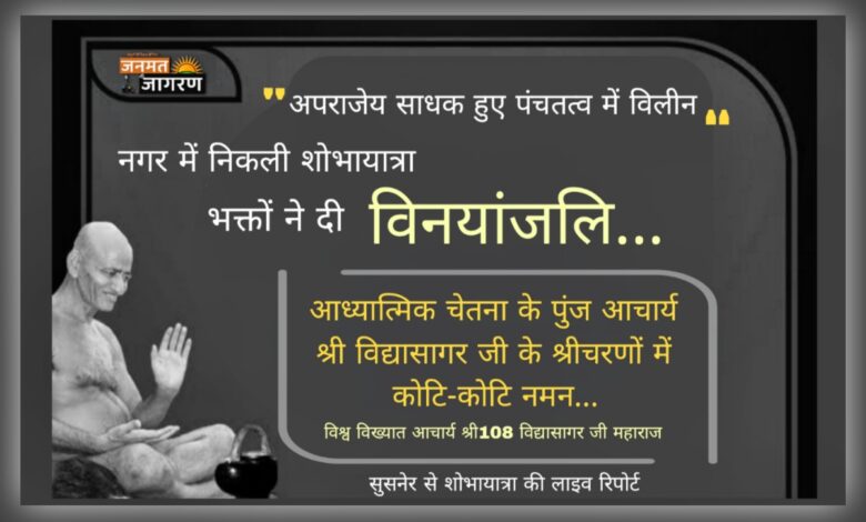 जनमत जागरण @ सुसनेर से दीपक जैन की लाइव रिपोर्ट :: संपूर्ण विश्व में जैन समाज के लिए आज का दिन सबसे कठिन है । समाज के वर्तमान के महावीर कहे जाने वाले आचार्य विद्यासागर महाराज ने देह त्याग दी और पूरी विधि के साथ समाधि ली । अपराजेय साधक के पंचतत्व में विलीन होने के बाद पूरा नगर भाव-विह्वल हुआ । इस अविस्मरणी क्षण के बाद स्थानीय जैन समाज व आचार्य श्री के भक्तों ने अपने प्रतिष्ठान बंद रख दोपहर को नगर में उनके चित्र की शोभायात्रा निकालकर विनयांजलि अर्पित की।