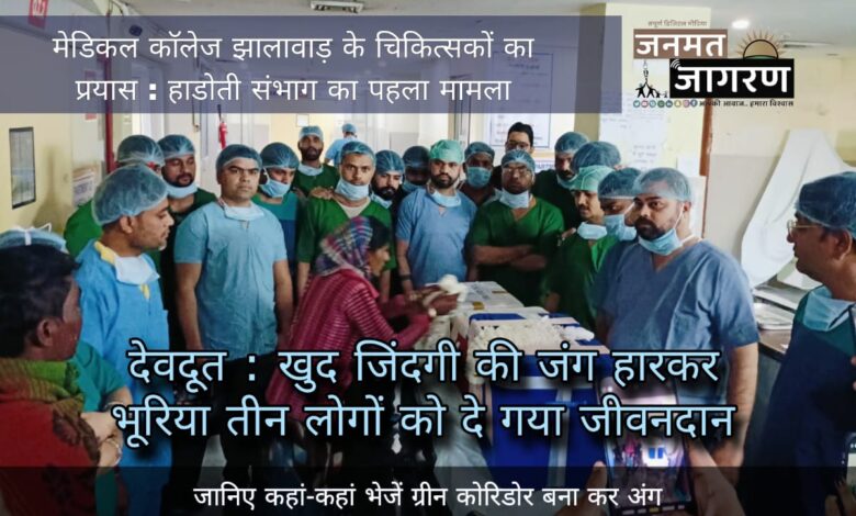 рдЭрд╛рд▓рд╛рд╡рд╛рдб рдЬрд┐рд▓реЗ рдХреЗ рдПрдХ рдпреБрд╡рдХ рдХреЗ рдЕрдВрдЧ рдЪрд┐рдХрд┐рддреНрд╕рдХреЛрдВ рдиреЗ рдкрд░рд┐рдЬрдиреЛрдВ рдХреА рд╕рд╣рдорддрд┐ рдХреЗ рдмрд╛рдж рд░рд╡рд┐рд╡рд╛рд░ рд╕реБрдмрд╣ рд╕реБрд░рдХреНрд╖рд┐рдд рдирд┐рдХрд╛рд▓рдХрд░ рдХреЛрдЯрд╛, рдЬрдпрдкреБрд░ рдФрд░ рдЬреЛрдзрдкреБрд░ рднрд┐рдЬрд╡рд╛рдП рд╣реИрдВред рдпреЗ рдЕрдВрдЧ рдЕрдиреНрдп рд░реЛрдЧрд┐рдпреЛрдВ рдХреЛ рдкреНрд░рддреНрдпрд╛рд░реЛрдкрд┐рдд рдХрд┐рдП рдЬрд╛рдПрдВрдЧреЗред рдЭрд╛рд▓рд╛рд╡рд╛рдб рдореЗрдбрд┐рдХрд▓ рдХрд╛реЕрд▓реЗрдЬ рдХреЗ рдЪрд┐рдХрд┐рддреНрд╕рдХреЛрдВ рдХреЗ рдкреНрд░рдпрд╛рд╕ рд╕реЗ рд╣реБрдЖ рдпреЗ рдХрд╛рд░реНрдп рд╣рд╛рдбреЛрддреА рд╕рдВрднрд╛рдЧ рдХрд╛ рдкрд╣рд▓рд╛ рдХрд╛рдо рд╣реИред