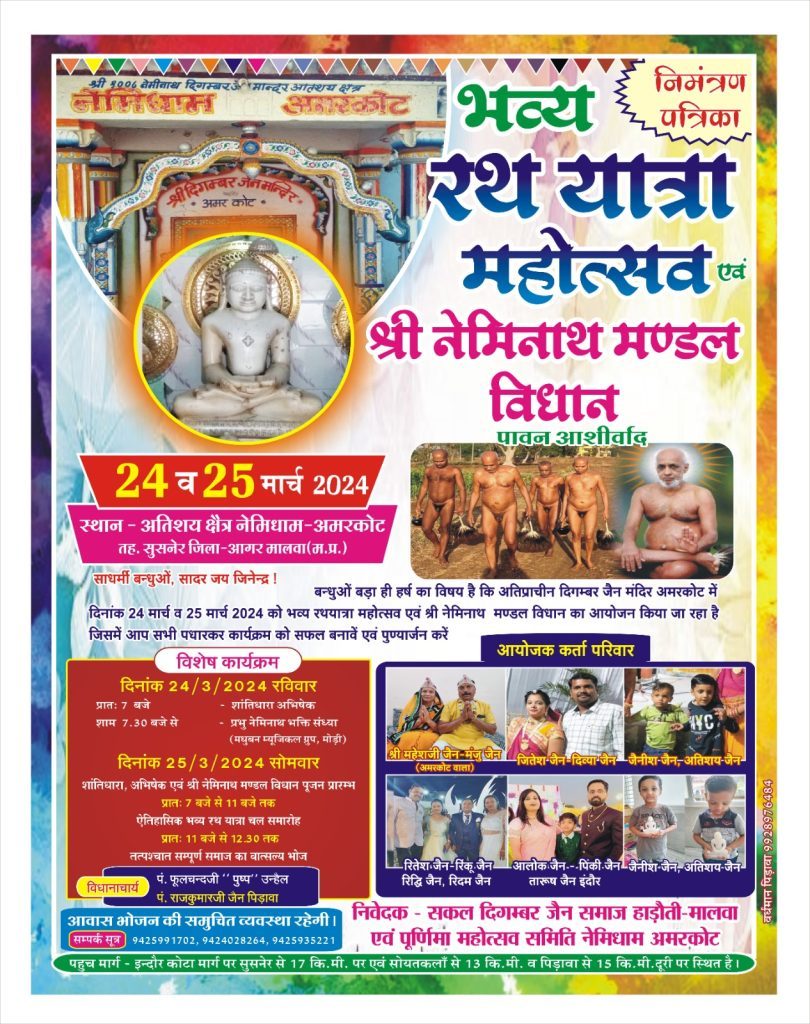 जनमत जागरण @ सुसनेर ::नगर के समीपस्थ ग्राम अमरकोट में स्थित दिगम्बर जैन अतिशय क्षेत्र नेमिधाम में होली के अवसर पर दो दिवसीय पूर्णिमा महोत्सव व वार्षिक रथ यात्रा का आयोजन किया जाएगा। आयोजन मुनि भूतबलि सागर जी ससंघ की प्रेरणा से दिगम्बर जैन समाज एवं पूर्णिमा महोत्सव समिति के द्वारा किया जाएगा। नेमिधाम पूर्णिमा महोत्सव समिति के मीडिया प्रभारी ऋषभ जैन ने बताया कि प्रतिवर्षानुसार इस वर्ष भी होली के अवसर पर 24 व 25 मार्च को नेमिधाम अमरकोट में दो दिवसीय धार्मिक आयोजन होंगे। आयोजन लाभार्थी महेश कुमार, जीतेश जैन, रितेश जैन, आलोक जैन, जैनिश व अतिशय जैन परिवार इंदौर के द्वारा किया जा रहा है। इस दौरान 24 मार्च रविवार को सुबह भगवान का शांतिधारा व अभिषेक एवं शाम को मधुबन म्युजिकल ग्रुप मोड़ी के द्वारा भक्ति संध्या होंगी। 25 मार्च सोमवार को पूर्णिमा के दिन सुबह भगवान का अभिषेक, शांतिधारा, नित्य नियम पूजन के साथ नेमिनाथ मण्डल विधान का संगीतमय पूजन होगा। उसके बाद दोपहर में बैंडबाजों के साथ ग्राम में श्री जी की रथयात्रा का चल समारोह निकाला जाएगा। कार्यक्रम समापन पर वात्सल्य भोज होगा। इस अवसर पर राजस्थान सहित मध्यप्रदेश के विभिन्न शहरों से श्रद्धालु कार्यक्रम में शामिल होंगे।