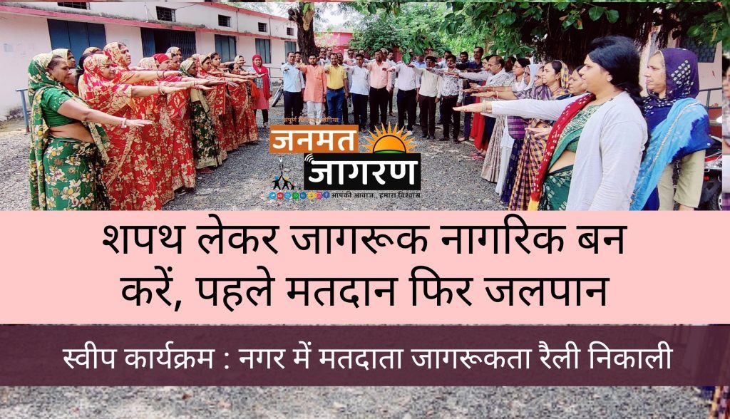 рдХрд▓реЗрдХреНрдЯрд░ рдПрд╡рдВ рдЬрд┐рд▓рд╛ рдирд┐рд░реНрд╡рд╛рдЪрди рдЕрдзрд┐рдХрд╛рд░реА рдорд╣реЛрджрдп рдХреЗ рдирд┐рд░реНрджреЗрд╢рд╛рдиреБрд╕рд╛рд░ рд▓реЛрдХрд╕рднрд╛ рдирд┐рд░реНрд╡рд╛рдЪрди 2024 рд╕реНрд╡рд┐рдк рдЧрддрд┐рд╡рд┐рдзрд┐ рдЕрдВрддрд░реНрдЧрдд рд╢рд┐рдХреНрд╖рд╛ рд╡рд┐рднрд╛рдЧ рдПрд╡рдВ рдирдЧрд░ рдкрд╛рд▓рд┐рдХрд╛ рдХрд░реНрдордЪрд╛рд░реА рдПрд╡рдВ рдорд╣рд┐рд▓рд╛ рдмрд╛рд▓ рд╡рд┐рдХрд╛рд╕ рд╡рд┐рднрд╛рдЧ рдХреЗ рд╕рд╣рдпреЛрдЧ рд╕реЗ рдорддрджрд╛рддрд╛ рдЬрд╛рдЧрд░реВрдХрддрд╛ рд░реИрд▓реА рдирд┐рдХрд╛рд▓реА рдЧрдИ рддрдерд╛ рд╢рдкрде рд▓реА рдЧрдИред