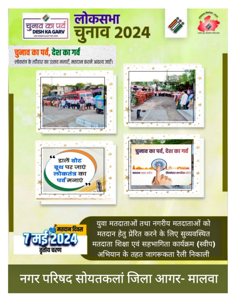 рдЬрдирдордд рдЬрд╛рдЧрд░рдг @ рд╕реЛрдпрддрдХрд▓рд╛рдВ :: рд▓реЛрдХрд╕рднрд╛ рдЪреБрдирд╛рд╡ 2024 рдореЗрдВ рдЕрдзрд┐рдХ рд╕реЗ рдЕрдзрд┐рдХ рдорддрджрд╛рддрд╛рдУрдВ рдХреА рднрд╛рдЧреАрджрд╛рд░реА рд╕реБрдирд┐рд╢реНрдЪрд┐рдд рдХрд░рдиреЗ рдХреЗ рдЙрджреНрджреЗрд╢реНрдп рд╕реЗ рдорд╣рд┐рд▓рд╛ рдПрд╡рдВ рдпреБрд╡рд╛ рдорддрджрд╛рддрд╛рдУрдВ рддрдерд╛ рдирдЧрд░реАрдп рдорддрджрд╛рддрд╛рдУрдВ рдХреЛ рдорддрджрд╛рди рд╣реЗрддреБ рдкреНрд░реЗрд░рд┐рдд рдХрд░рдиреЗ рдХреЗ рд▓рд┐рдП рд╕реБрд╡реНрдпрд╡рд╕реНрдерд┐рдд рдорддрджрд╛рддрд╛ рд╢рд┐рдХреНрд╖рд╛ рдПрд╡рдВ рд╕рд╣рднрд╛рдЧрд┐рддрд╛ рдХрд╛рд░реНрдпрдХреНрд░рдо (рд╕реНрд╡реАрдк) рдЕрднрд┐рдпрд╛рди рдХреЗ рддрд╣рдд рдЬрд╛рдЧрд░реВрдХрддрд╛ рд░реИрд▓реА рдирд┐рдХрд╛рд▓реАред