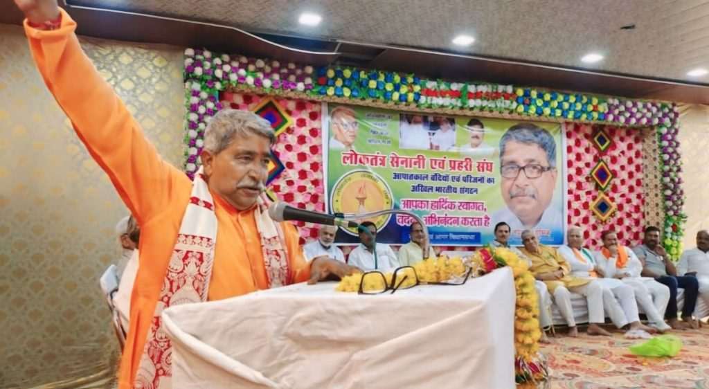 ЁЯЯарджреЗрд╢ рдХреЛ рдмрдЪрд╛рдиреЗ рдХреЗ рд▓рд┐рдП рд▓реЛрдХрддрдВрддреНрд░ рдкреНрд░рд╣рд░рд┐рдпреЛрдВ рдХреЛ рддреАрд╕рд░реА рд▓реЬрд╛рдИ рд▓реЬрдиреЗ рдХреЗ рд▓рд┐рдП рднреА рддреИрдпрд╛рд░ рд░рд╣рдирд╛ рд╣реЛрдЧрд╛ :: рдЗрд╕ рдЕрд╡рд╕рд░ рдкрд░ рд▓реЛрдХрддрдВрддреНрд░ рд╕реЗрдирд╛рдиреА рдЧрд┐рд░рд┐рд░рд╛рдЬ рдкреБрд░реЛрд╣рд┐рдд рдиреЗ рднреА рдХрд╛рд░реНрдпрдХреНрд░рдо рдХреЛ рд╕рдореНрдмреЛрдзрд┐рдд рдХрд░рддреЗ рд╣реБрдП рдХрд╣рд╛ рдХрд┐ рд▓реЛрдХрддрдВрддреНрд░ рд╕реЗрдирд╛рдирд┐рдпреЛрдВ рдиреЗ рдЖрдЬрд╛рджреА рдХреА рджреВрд╕рд░реА рд▓реЬрд╛рдИ рдЖрдкрд╛рддрдХрд╛рд▓ рдХрд╛ рд╡рд┐рд░реЛрдз рдХрд░рддреЗ рд▓реЬреА рдереАред рдкрд░рдиреНрддреБ рдЕрдм рдкреБрдирдГ рджреЗрд╢ рдХреЛ рдмрдЪрд╛рдиреЗ рдХреЗ рд▓рд┐рдП рд▓реЛрдХрддрдВрддреНрд░ рдкреНрд░рд╣рд░рд┐рдпреЛрдВ рдХреЛ рддреАрд╕рд░реА рд▓реЬрд╛рдИ рд▓реЬрдиреЗ рдХреЗ рд▓рд┐рдП рднреА рддреИрдпрд╛рд░ рд░рд╣рдирд╛ рд╣реЛрдЧрд╛ред рдХреНрдпреЛрдВрдХрд┐ рдЖрдЬ рдЬреЛ рд╕рдВрд╡рд┐рдзрд╛рди рд╣рд╛рде рдореЗ рд▓реЗрдХрд░ рдкреВрд░реЗ рджреЗрд╢ рдореЗ рдШреВрдо рд░рд╣реЗ рд╣реИ рдЙрдирдХреЛ рдкрд╢реНрдЪрд┐рдо рдмрдВрдЧрд╛рд▓ рдХреА рдмрдВрдЧрд▓рд╛рджреЗрд╢ рд╕реЗ рд▓рдЧреА рднрд╛рд░рдд рдХреА 70 рдХрд┐рд▓реЛрдореАрдЯрд░ рдХреА рдкрд░рд┐рдзрд┐ рдореЗрдВ рдХреИрд╕реЗ рд╕рдВрд╡рд┐рдзрд╛рди рдХрд╛ рдЧрд▓рд╛ рдШреЛрдВрдЯрд╛ рдЬрд╛рдХрд░ рдорд╣рд┐рд▓рд╛рдУрдВ рдХреЛ рдирд┐рд╡рд╕реНрддреНрд░ рдХрд░ рдорд╛рд░рд╛рдкреАрдЯрд╛ рдЬрд╛ рд░рд╣рд╛ рд╣реИ рдФрд░ рд╡рд╣рд╛рдВ рдХреА рд╕рд░рдХрд╛рд░ рдЙрдирдХреА рд░рдХреНрд╖рд╛ рдХрд░рдиреЗ рдХреЗ рдмрдЬрд╛рдп рд╢рд░рд┐рдпрд╛ рдХрд╛рдиреВрди рдХрд╛ рдкрд╛рд▓рди рдХрд░рд╡рд╛рддреА рд╣реИ рд╡реЛ рдЙрди рд▓реЛрдЧреЛ рдХреЛ рдирд╣реА рджрд┐рдЦрд╛рдИ рджреЗ рд░рд╣рд╛ рд╣реИред рдзреАрд░реЗ рдзреАрд░реЗ рдпреЗ рд╕реНрдерд┐рддрд┐ рдкреВрд░реЗ рднрд╛рд░рдд рдХреА рд╣реЛрдЧреА рддрдм рдЖрдк рд▓реЛрдХрддрдВрддреНрд░ рдкреНрд░рд╣рд░рд┐рдпреЛрдВ рдХреЛ рд╕рдВрд╡рд┐рдзрд╛рди рдФрд░ рджреЗрд╢ рдХреЛ рдмрдЪрд╛рдиреЗ рдХреА рддреАрд╕рд░реА рд▓реЬрд╛рдИ рдХреЗ рд▓рд┐рдП рддреИрдпрд╛рд░ рд░рд╣рдирд╛ рд╣реЛрдЧрд╛ред рдХрд╛рд░реНрдпрдХреНрд░рдо рдХреЛ рдЬрд┐рд▓рд╛ рдкреНрд░рд╣рд░реА рд╕рдВрдШ рд╕рдВрдпреЛрдЬрдХ рд░рд╛рдЬреЗрд╢ рджреЗрд╕рд╛рдИ рдиреЗ рд╕рдореНрдмреЛрдзрд┐рдд рдХрд░рддреЗ рд╣реБрдП рдХрд╣рд╛ рдХрд┐ рджреЗрд╢ рдореЗ рдШрдЯрддреЗ рдХреНрд░рдо рдореЗрдВ рдХреЛрдИ рд╕рдВрдЧрдарди рд╣реИ рддреЛ рд╡реЛ рд▓реЛрдХрддрдВрддреНрд░ рд╕реЗрдирд╛рдиреА рд╕рдВрдШ рд╕рдВрдЧрдарди рд╣реИ рдЗрд╕реАрд▓рд┐рдП рд▓реЛрдХрддрдВрддреНрд░ рдкреНрд░рд╣рд░реА рд╕рдВрдШ рдХреА рд╕реНрдерд╛рдкрдирд╛ рдХреА рдЧрдИ рд╣реИред рддрд╛рдХрд┐ рд▓реЛрдХрддрдВрддреНрд░ рд╕реЗрдирд╛рдирд┐рдпреЛрдВ рдХреЗ рдмрд╛рдж рдЙрдирдХреЗ рдкрд░рд┐рдЬрдиреЛрдВ рдХреЛ рдпреЗ рдпрд╛рдж рд░рд╣реЗ рдХрд┐ рд╣рдорд╛рд░реЗ рдкреБрд░рдЦреЛ рдиреЗ рд▓реЛрдХрддрдВрддреНрд░ рдХреА рд░рдХреНрд╖рд╛ рдХреЗ рд▓рд┐рдП рдпрд╛рддрдирд╛рдПрдВ рдЭреЗрд▓реА рд╣реИ рддреЛ рд╣рдореЗ рднреА рд╕рдордп рдЖрдиреЗ рдкрд░ рд▓реЛрдХрддрдВрддреНрд░ рдФрд░ рджреЗрд╢ рдХреА рд░рдХреНрд╖рд╛ рдХреЗ рд▓рд┐рдП 